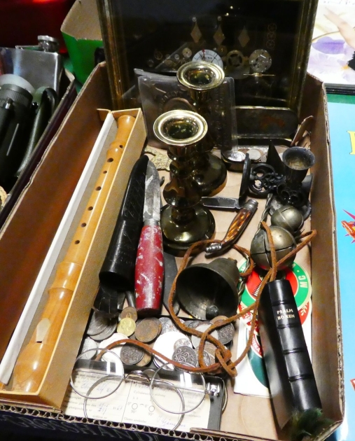 180. Låda mynt fällkniv ljusstakar klocktavla mm