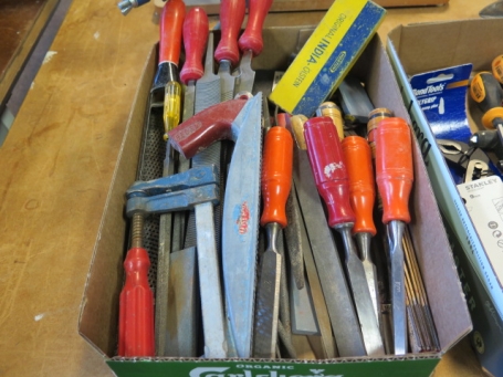 180. Låda snickeri.. stämjärn filar mm