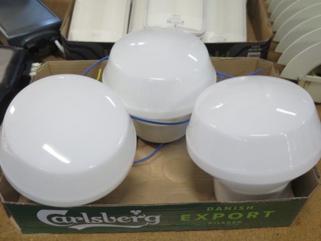565. Låda belysningsarmaturer Ahlsell 220 V samt batteri 6 V