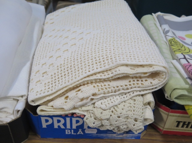 350. Låda dukar.. linne.. damast