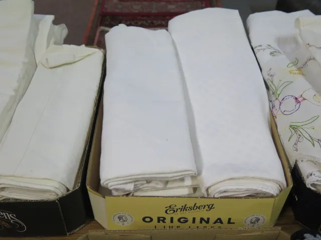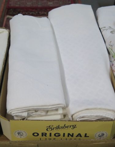 439. Låda vita bordsdukar..