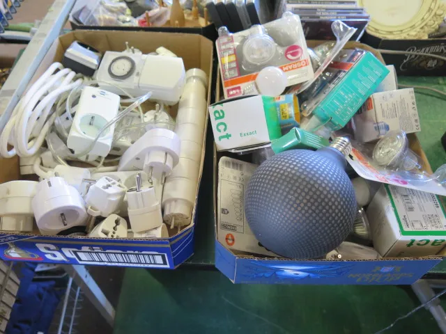 137. Lådor elektronik glödlampor timer mm