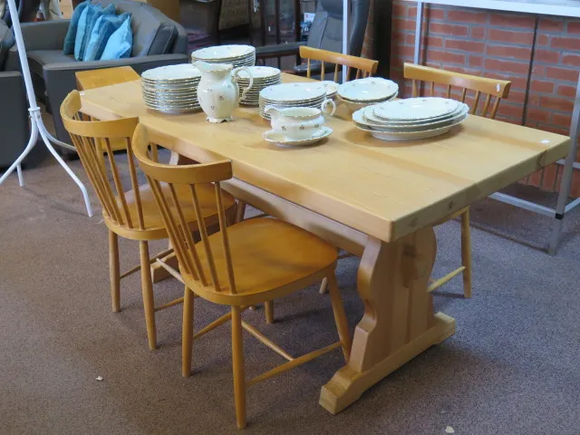 66. Matgrupp bord furu skivtjocklek 5,5 cm/4 pinnstolar