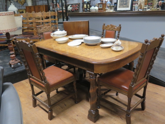 Matsalsgrup antikt bord 4 stolar 2 iläggskivor