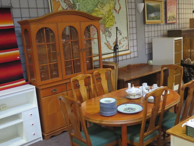 Matsalsgrupp bord ilägg 6 stolar spröjsat vitrinskåp.. Bra skick