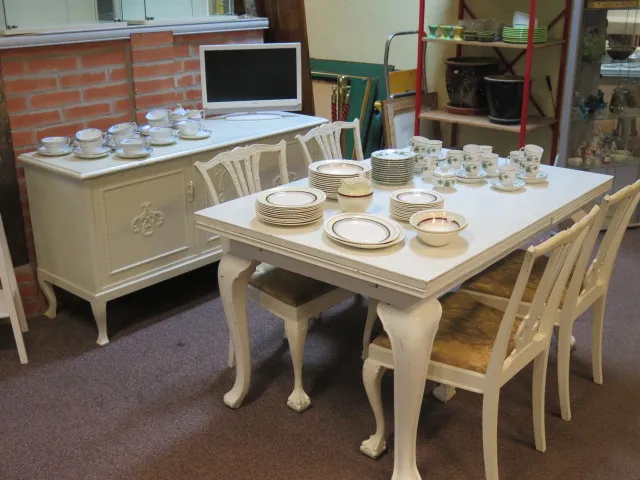 54. Matsalsgrupp i vitmålad rokokostil bord utdragsbara skivor 4 stolar skänk