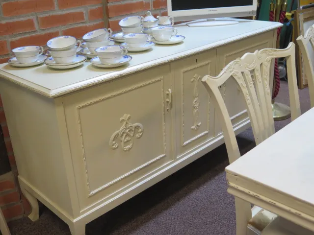 Matsalsgrupp i vitmålad rokokostil bord utdragsbara skivor 4 stolar skänk