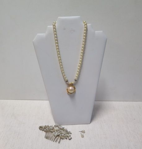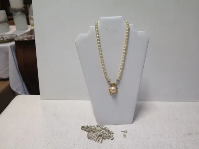 Pärlhalsband/paret örhängen/hårkam m strass o pärlor