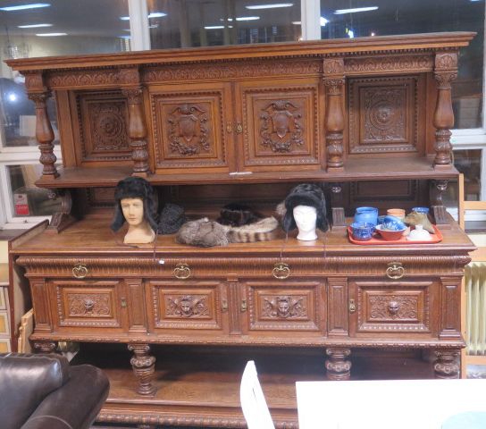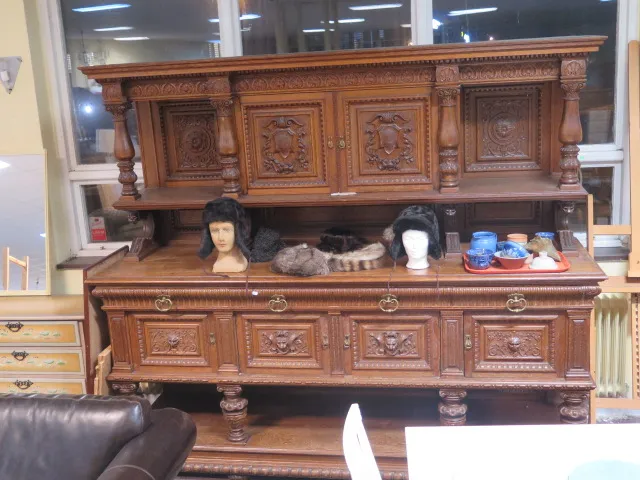 213. Rikt skuret praktskåp ek 3 lådor 240x76x214 cm