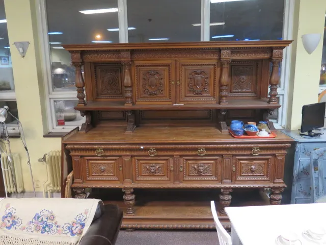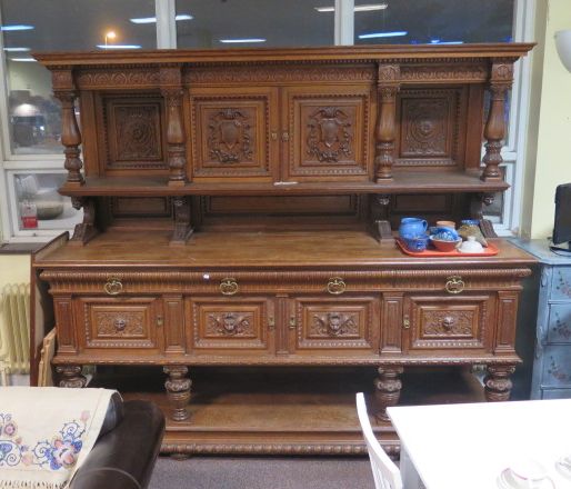 222. Rikt skuret praktskåp ek 3 lådor 240x76x214 cm