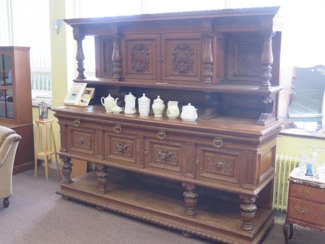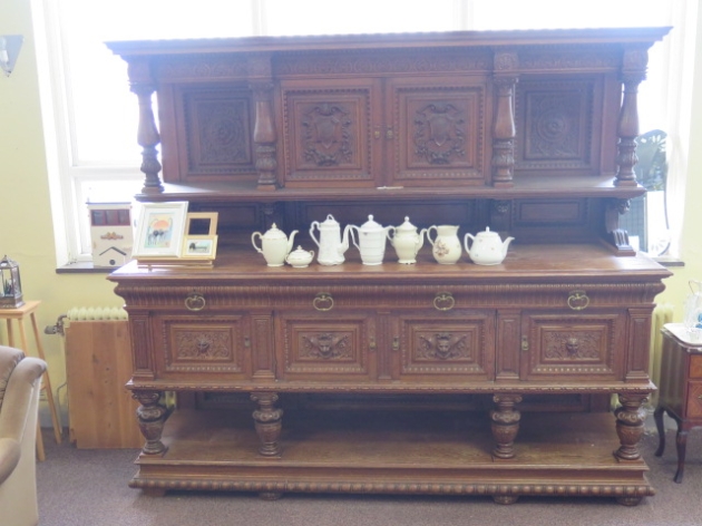 259. Rikt skuret praktskåp ek 3 lådor 240x76x214 cm