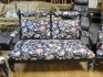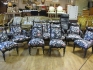 Består av soffa b-145 cm, 6 stolar varav två karmstolar.. Textilen inköpt USA under resa..