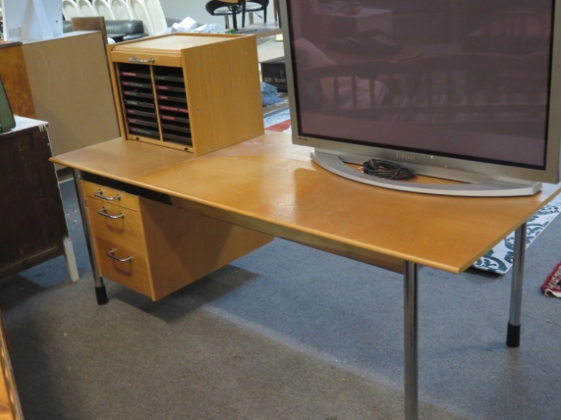 313. Skrivbord 3 lådor metallstomme l:190 cm/rullklaffshurts