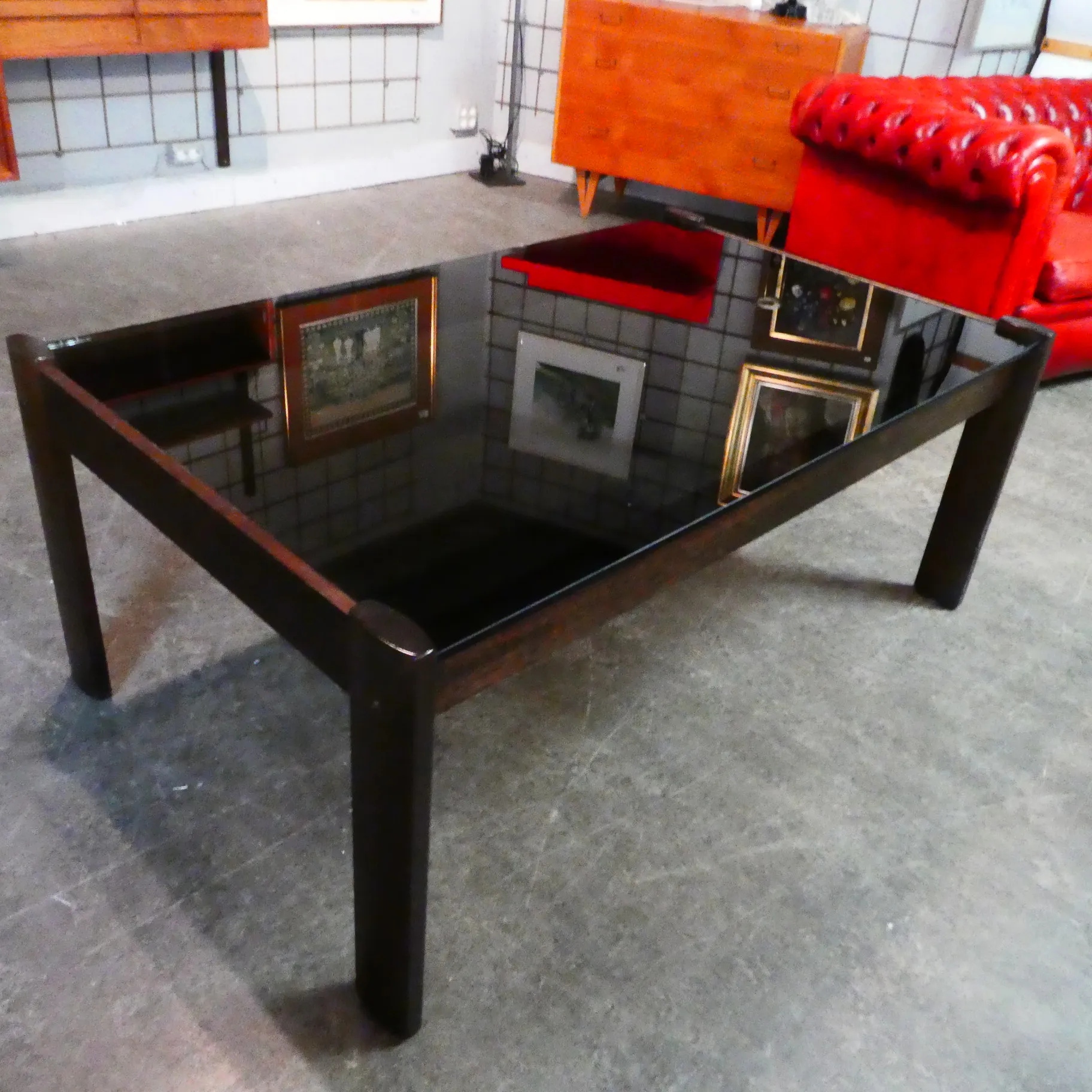 Soffbord röktonad glasskiva 1980-tal l:126 cm