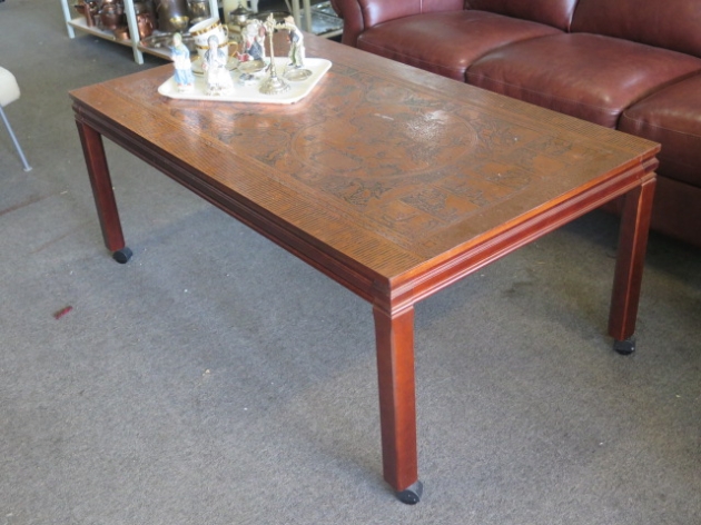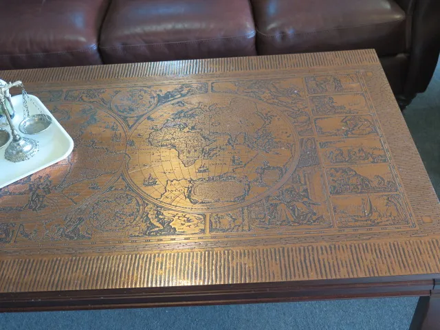 319. Soffbord skiva med kopparrelief dekor l:140 cm