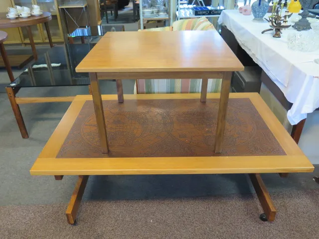 294. Soffbord teak på hjul koppar relief skiva/ sidobord teak