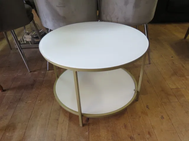Soffbord vitlackerade glasskivor på metallunderrede. d-65 cm