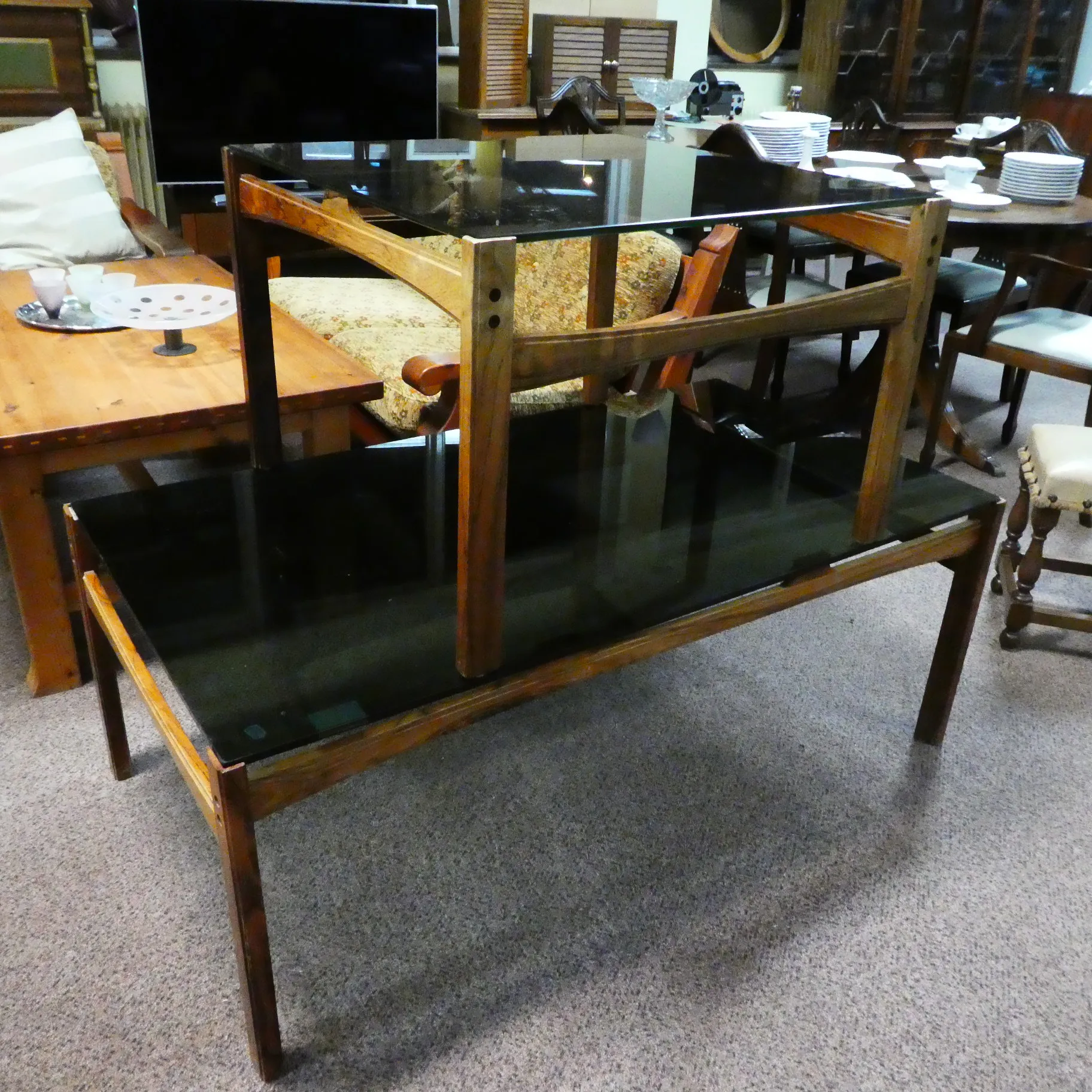 247. Soffbord/lampbord rökfärgad glasskiva trä underrede l:71-140 cm