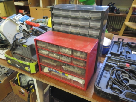 Sortimentsskåp m innehåll Raaco samt Claes Ohlsson