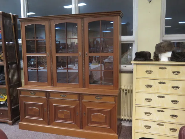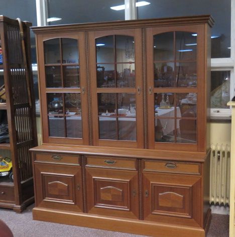 Spröjsat bokskåp mahogny m belysning 3 lådor 153x185 cm