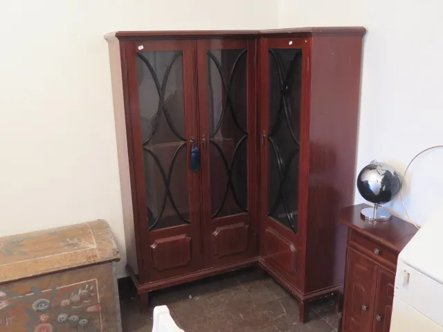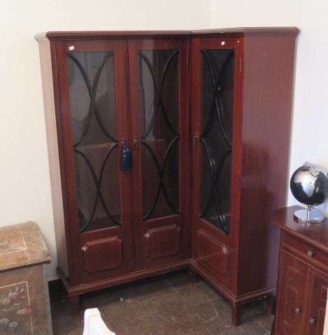 Spröjsat hörnbokskåp mahogny 1920-talet.. 110x82x160 cm