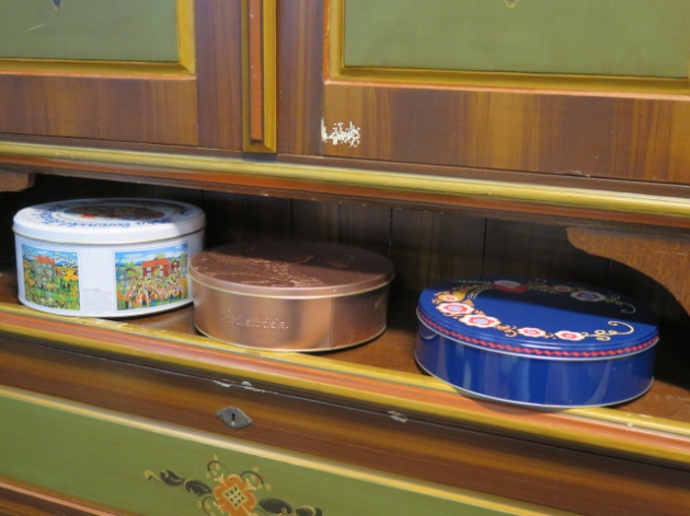 656. Antikt salskåp m skrivklaff senare bemålning b:138 cm