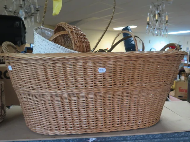 123. Stor tvättkorg m innehåll av små korgar
