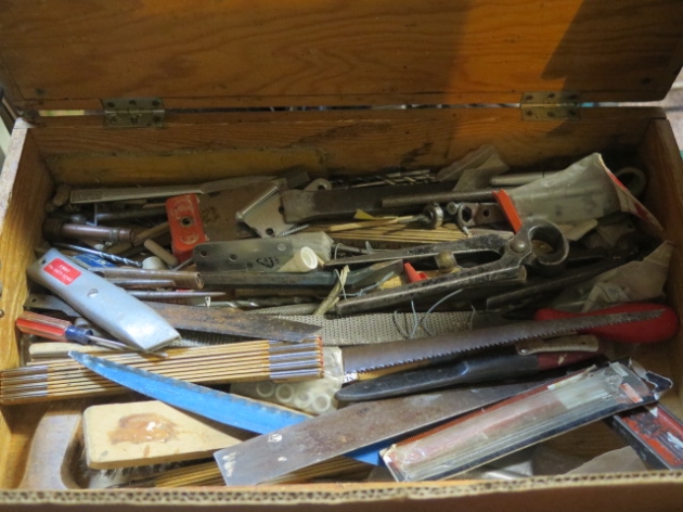 Trälåda m div innehåll.. vinkelhake.. stämjärn.. hovtång mm