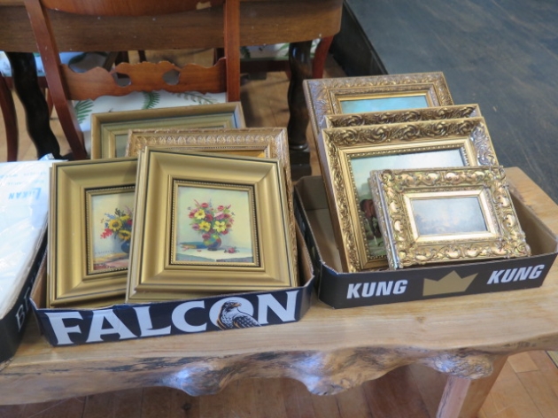 Två lådor inramade tavlor