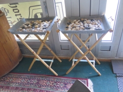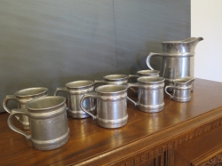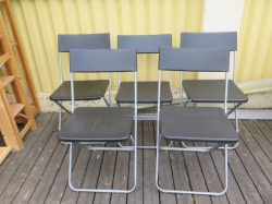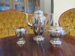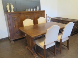 Bord 150x85 cm.. 4 högryggade omklädda stolar, serveringsskåp 178x120 cm.. Lejontassar